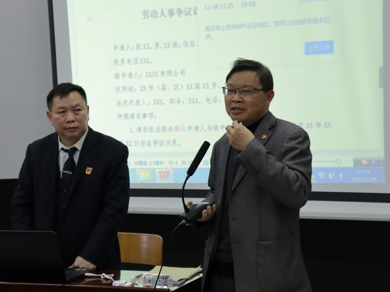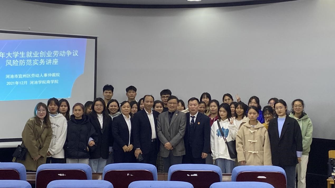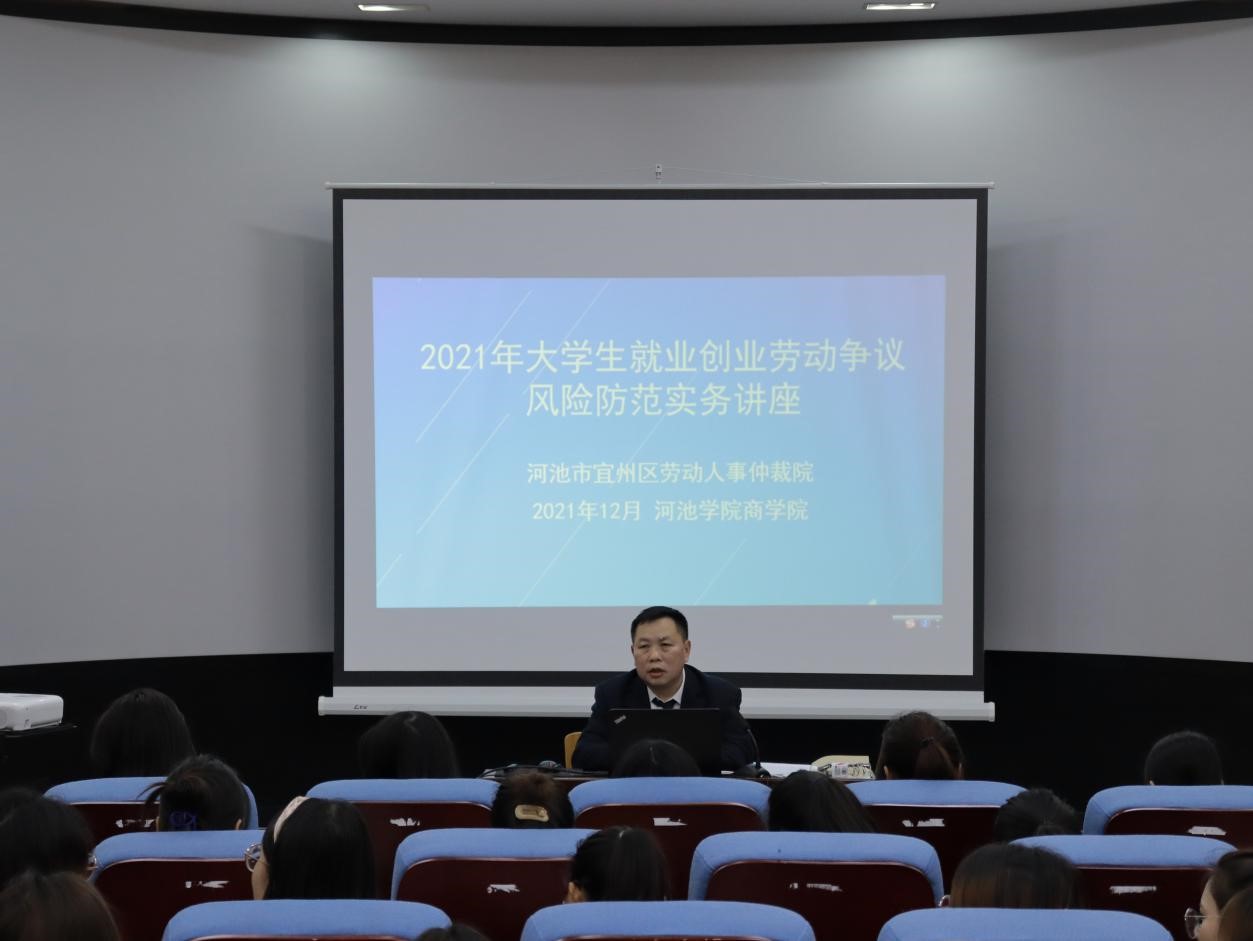 12月8日下午,河池市宜州区劳动人事仲裁院院长谭少尉应邀为9001cc金沙以诚为本人力资源管理专业2020级学生开展“大学生就业创业劳动争议风险防范实务”专题讲座。我院党委书记韦书觉、人力资源管理系主任刘智参加此次讲座。讲座于我院弘毅楼3-504报告厅举行,由刘智主持。